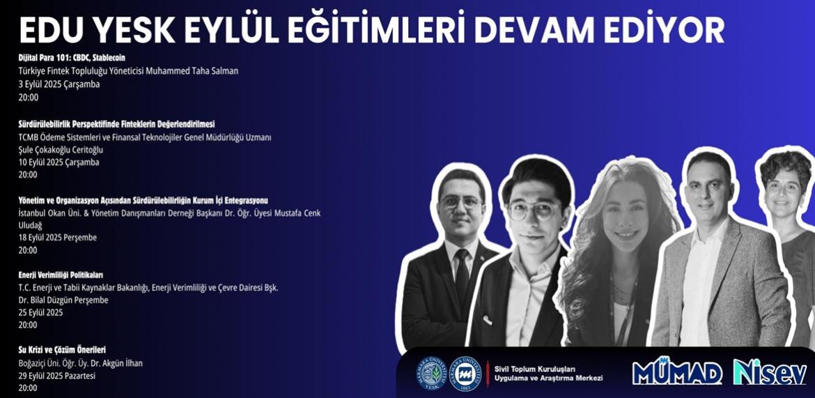 18 Eylül 2025 tarihinde EDU YESK Yaz Okulu kapsamında Mustafa Cenk Uludağ tarafından "Yönetim ve Organizasyon Açısından Sürdürülebilirliğin Kurum İçi Entegrasyonu" eğitimi verildi.