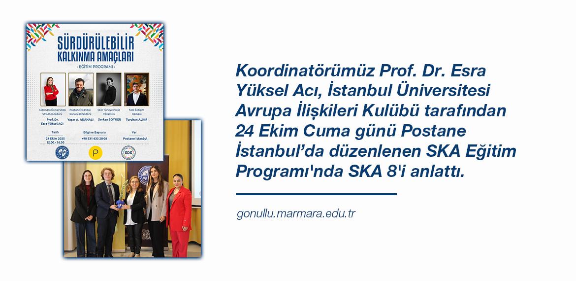 Koordinatörümüz Prof.Dr.Esra Yüksel Acı, İstanbul Üniversitesi Avrupa İlişkileri Kulübü tarafından 24 Ekim Cuma günü Postane İstanbul’da düzenlenen SKA Eğitim Programı'nda SKA 8'i anlattı.