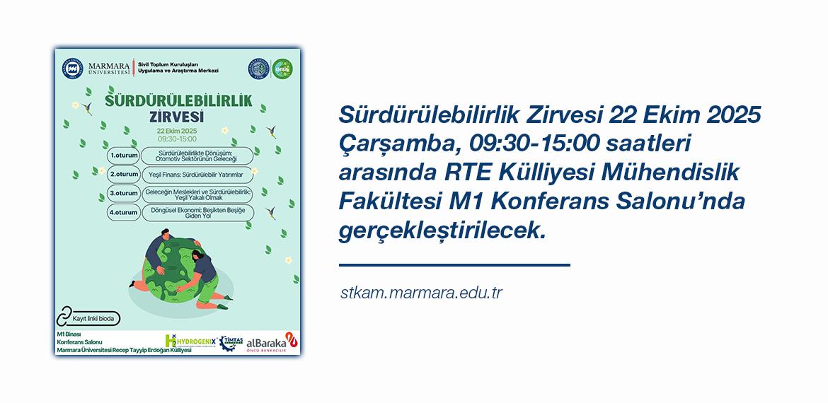 Sürdürülebilirlik Zirvesi 22 Ekim 2025 Çarşamba, 09:30-15:00 saatleri arasında RTE Külliyesi Mühendislik Fakültesi M1 Konferans Salonu’nda gerçekleştirilecek.
